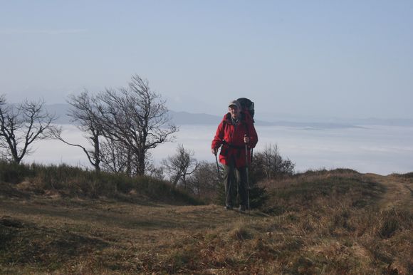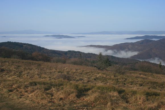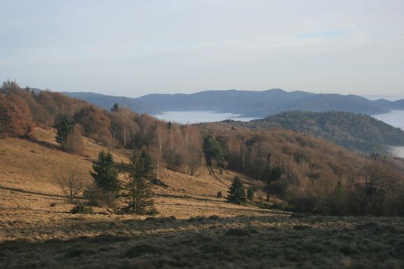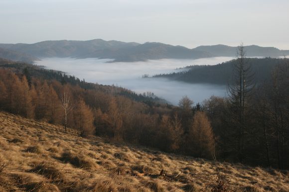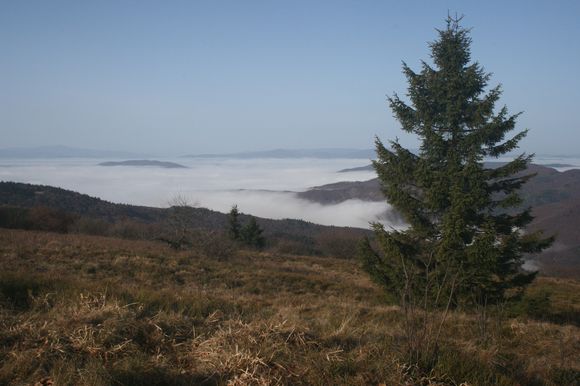 V sobotu ráno sa stretávame na stanici, stihol som si kúpiť nejaké pečivo a kefírové mliečko, potom noviny a lístky a po obligátnej slovnej kontrole, či máme všetko potrebné, nastupujeme do vlaku. Je až nepríjemne vykúrený, ťahá nás do driemot. V Lipanoch máme tri minúty na prestup do jednovozňového motoráčiku smer Plaveč. Pohľad z okna je pochmúrny – hmla, sychravo, vlhko, chladno. Až vo mne klíčia pochybnosti, našťastie ich zadupávam hlboko pod čiernu zem. V obci Ďurková máme prvý orientačný problém, ktorý musí vyriešiť až mapa, lebo nič okolo seba nevidíme. Na odbočke ku Šarišskému Jastrabiu prezliekam bundu, dávame štartovací pohárik rumu a šliapeme. Za obcou nás vedie žltá značka lúkami, po rozbahnenej ceste. Orientácia je sťažená absenciou výhľadu do okolia. Pod lesom bahna pribúda, tak si bahníme. Na kóte Hriňová máme vystúpaných už skoro osemsto výškových metrov a Tibor je čoraz netrpezlivejší, kedyže bude svietiť Slnko, o ktorom som mu nadšene vykladal vo vlaku. O inverzii už kadečo počul, ale live ju nezažil. Vybaľuje si nové trekové paličky, ja som nebral, hovorím, že až od 1500 metrov vyššie. Konečne sa okolo nás pretrháva biely závoj hmly a nad sebou vidíme ostrovčeky kráľovskej modrej – oblohy. Nálada sa nám rapídne lepší, až si dávame pauzu, lebo Tibor povedal, že musíme dbať na správny pitný režim. Konečne sme nad hornou hranicou hmly, v lese začína byť príjemne. Vychádzame do sedla a nesmelo sa nám otvárajú výhľady na krajinu pod nami, ktorú vlastne len tušíme, lebo je zaliata sladkou bielou smotanou. Pred záverečným stúpaním na vrchol sa dostávam do správnej chodeckej eufórie a šliapem vytrvalo, až kým sa ďalej nedá. Dvojica turistov pred vetrom učupená za vrcholovým pylónom na mňa udivene zazerá, nezačuli, kedy som došiel. Zhadzujem batoh, rozhliadam sa okolo a je čo obdivovať. Z mliečneho oceánu vykukujú tmavé ostrovčeky roztratených kopcov. Rýchlo vyberám ploskačku, lebo už sa blíži Horský vlk II a musím mu patrične pogratulovať k zdolaniu najvyššieho vrchu Čergovského pohoria s nadmorskou výškou 1157 m. A k tomu patrí aj jeden frťan. Užívame si neuveriteľných výhľadov, zažívam fotobláznenie, aj Tibor sa pridáva a fotí mobilom. Identifikujem trojvrchol Busova, aj kopček Magury, hrebeň Levočských vrchov, pieninské Tri koruny, zasnežené Tatry sú cudne zahalené v opare. Dlho sa ale nezdržiavame, ostro nás prefukuje. Pokračujeme ďalej a neustále sa otáčame, doľava, doprava i dozadu, stále je čo obdivovať. Príjemný trávnatý chodník postupne klesá, vedie po rozsiahlych lúkach s bohatými zárastami čučoriedok, bohužiaľ už sú úplne holé, bez plodov i bez lístia. Tesne pod vrcholom sú ostrovčeky snehu – pozostatok z temer polmetrovej vrstvy snehu, ktorý tu napadol pred tromi týždňami. Priebežne Tiborovi komentujem viaceré cesty, ktoré som tu ešte počas pôsobenia v Bardejova často podnikal. Mnohé zákutia sú mi hneď povedomé, mnohé zmenili svoju tvár. V sedle pod Forgáčkou stojíme dlhšie. Spomínam na rodinné táborenie, keď sme sa štyria tiesnili v dvojmiestnom stane, na večerné ohníky, umývanie v potoku, pozorovanie oblohy. Sú dve hodiny popoludní a my až teraz obedujeme. Rozložili sme sa na svahu, ktorý ožiaruje Slnko, je teplo a príjemne. Do sedla Priehyba to už nie je ďaleko, ale musíme zdolať Dvoriská. Skoro presne podľa prepočtov doň schádzame okolo pol štvrtej, už sa stmieva a cez sedlo sa prevaľuje slizká, vlhká a studená hmla. Priamo v sedle je lúka totálne rozbahnená od ťažkých mechanizmov, vraciame sa späť na lúku vedľa cesty. Voda sa nám minula, márne hľadám prameň, ktorý tu kedysi vyvieral. Rozdeľujeme si pracovné úlohy, ja zbieham do údolia smerom k Livovu pohľadať vodu, Tibor sa hotuje rozložiť oheň, lebo máme všetko prevlhnuté. Tenký potôčik nachádzam asi desať minút od táboriska, naberám skoro päť litrov vody a ruky mi pri návrate tuhnú od chladu a studenej vody. Tibor statočne bojuje s ohňom, ale nedarí sa mu presvedčiť ho, aby sa rozhorel, drevo je vlhké. Vyberáme sa najprv nazbierať drevo, potom už za svitu čeloviek staviame stan a nakoniec sa púšťame do založenia ohňa. Vypiplávame ho ako malé decko, od najtenších smrekových vetvičiek a plátkov brezovej kôry, cez asi centimeter hrubé konáriky, trpezlivosť sa vypláca a konečne sa chytajú aj hrubé vetvy a oheň veselo plápolá. Nastáva čas ukojiť hlad a smäd. Tibor nahadzuje svoj nový plynový Primus, voda raz-dva zovrie, varím polievku a večerný čaj, napájame sa rumom i Metaxou. Potom je na rade slaninka s horčicou a cibuľou, povedal som si, že môžem raz za čas ignorovať cestoviny a iné instantné gebuziny. Tibor generálne suší na paličkách rozvešané mokré oblečenie pri ohni, ja priamo na sebe, akurát topánky vytŕčam do plameňov. Priebežne si pripravujeme lôžka, Tibor vybaľuje ďalšiu novotu svojej výbavy – parádnu samonafukovaciu karimatku, dokonca s protišmykovou úpravou! Hmla sa postupne vytráca, nad nami sa rozprestrela nádherná hviezdna lúka s miliónmi žiariacich kvetín a mliečnou dráhou. Romantický večer podfarbuje zavýjanie dvoch vlkov, ktoré sa nečakane ozýva z náprotivného svahu a mierne nahlodáva pokoj a mier tohto večera. Tibor sa sám uisťuje, že vlci útočia len vo svorke a ja mu to nevyvraciam. Niečo pred ôsmou zaliezame do stanu, nastáva prezliekanie do spacieho prádla a súkanie sa do spacieho vreca. Stan sme nepostavili na ideálnej rovine, ale na naklonenej, viem, že v noci sa budem musieť súkať od vchodu späť nahor. Nakoniec zaspávame. Ráno jeden druhého presviedčame, že sme vôbec nespali, len sa prevaľovali v akýchsi polodriemotách, a že ten druhý 
