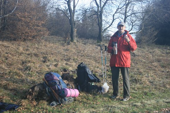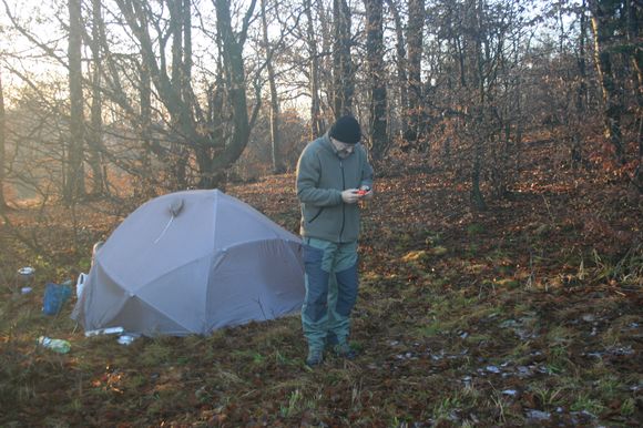Začínať nedeľu kalíškom Metaxy je parádny počin. Lahodne masíruje útroby intenzívnym teplom, až sa mi žiada ešte chvíľku pohovieť si v teple spacáku a zdriemnuť na desať minút. Tibor sa ale vyteperí vonku a hlási, že na tráve, ktorá je zmrznutá, je srieň, uhlíky v pahrebe ešte tlejú a na východe sa zapaľujú zore. Nedá mi to, a so zvolaním, keď sú zore, tak ja som hore, vyliezam zo spacáku. Prezliecť sa do chladných a vlhkých vecí vyžaduje značné mentálne vypätie a sebaovládanie. Je sedem hodín, nad obzorom vylieza Slnko, máme v pláne vyraziť najneskôr o ôsmej. Tibor zbiera drevo, aby rozdúchal oheň, ja varím čaj na raňajky, potom sa napchávame a znovu varíme čaj, tentoraz do termosiek. Balenie trvá o niečo dlhšie, aj skladanie stanu sa naťahuje, a keď vyrážame, s hrôzou hľadím na hodinky. Je pár minút pred deviatou. To budú teda fofry, ak sa máme dotrepať niekam k doprave ešte za vidna!